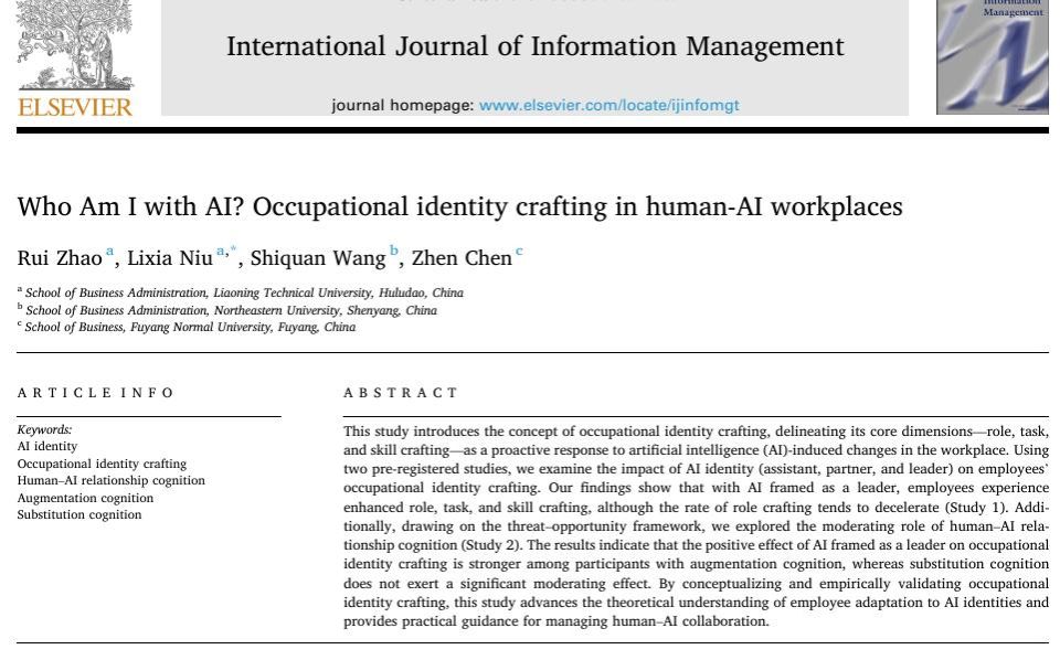 该论文聚焦人工智能深度嵌入工作场景背景下员工职业身份重塑这一关键现实与理论问题,创新性地提出了“职业身份重塑”概念,并将其系统划分为角色重塑、任务重塑与技能重塑三个核心维度,用以刻画员工对AI引发职业变革的主动适应过程。基于两项预注册研究,考察了人工智能被塑造为助手、合作者与领导者三种不同身份时,对员工职业身份重塑行为的影响差异,发现当AI被界定为领导者时,员工在三类重塑行为上均显著增强,但角色重塑的提升速度相对放缓;进一步结合威胁—机会框架,引入人机关系认知作为关键调节变量,结果表明在增强型认知占主导的情境下,AI领导身份对职业身份重塑的正向作用更为显著,而替代型认知并未发挥显著调节效应。该研究从概念提出与实证检验两个层面深化了对员工适应人工智能身份变化机制的理解,为组织在智能化转型过程中科学引导员工实现积极的人智协同提供了重要理论依据与实践启示。