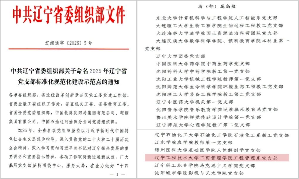 (通讯员 王永坤)2026年1月12日,中共辽宁省委组织部下发《关于命名2025年辽宁省党支部标准化规范化建设示范点的通知》(辽组通字〔2026〕5号),我院工程管理系党支部获评省(部)属高校2025年辽宁省党支部标准化规范化建设示范点。