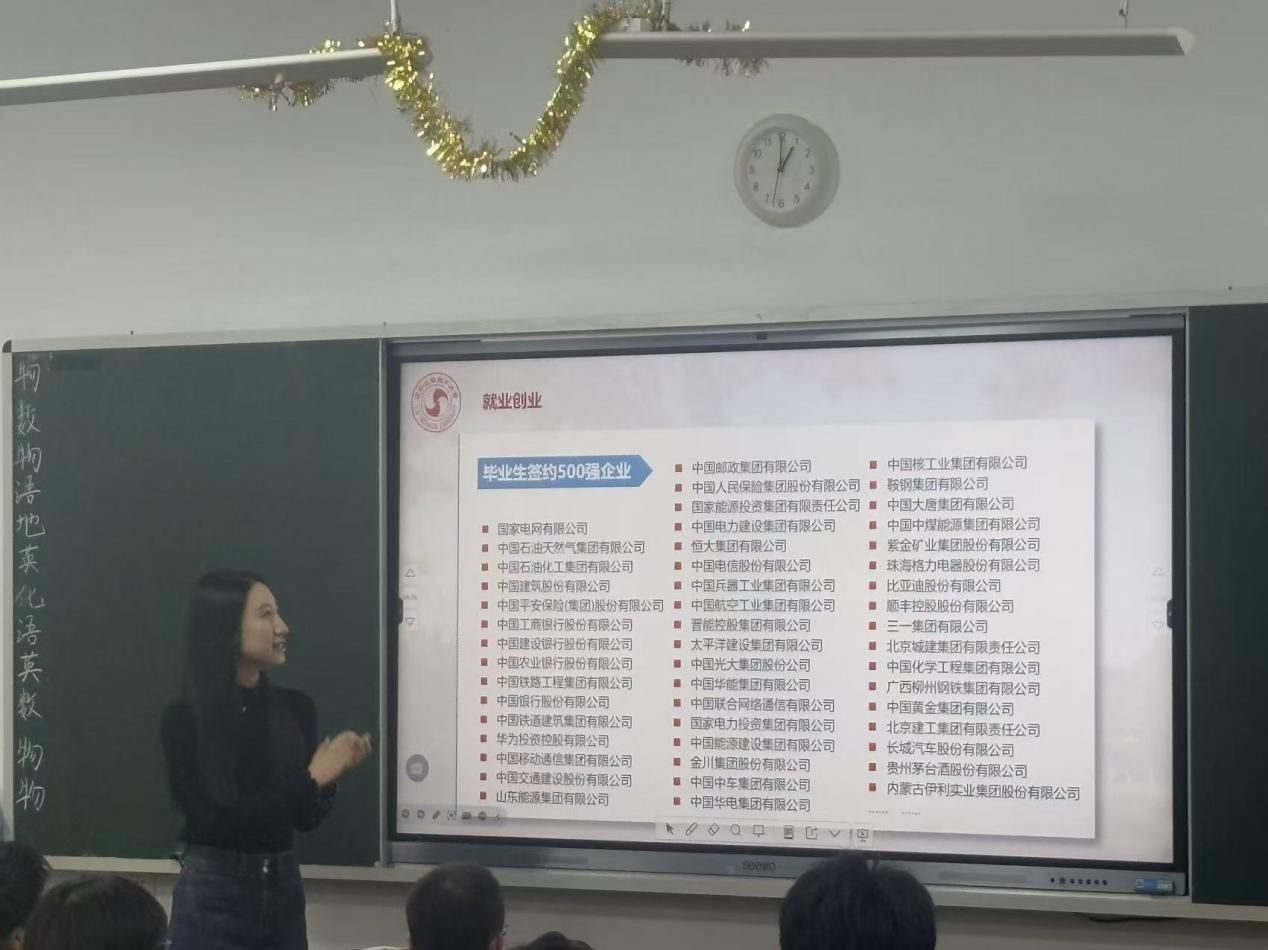 寒假期间,郭俊含同学依托PPT演示、现场答疑及互动交流等载体,全方位、多维度地解读了我校的办学特色、学科优势、国际交流项目、校园文化、奖助体系及就业升学前景。现场气氛热烈,互动频繁,其提供的信息与建议赢得了同学们的认可,激发了学子们报考我校的热情。