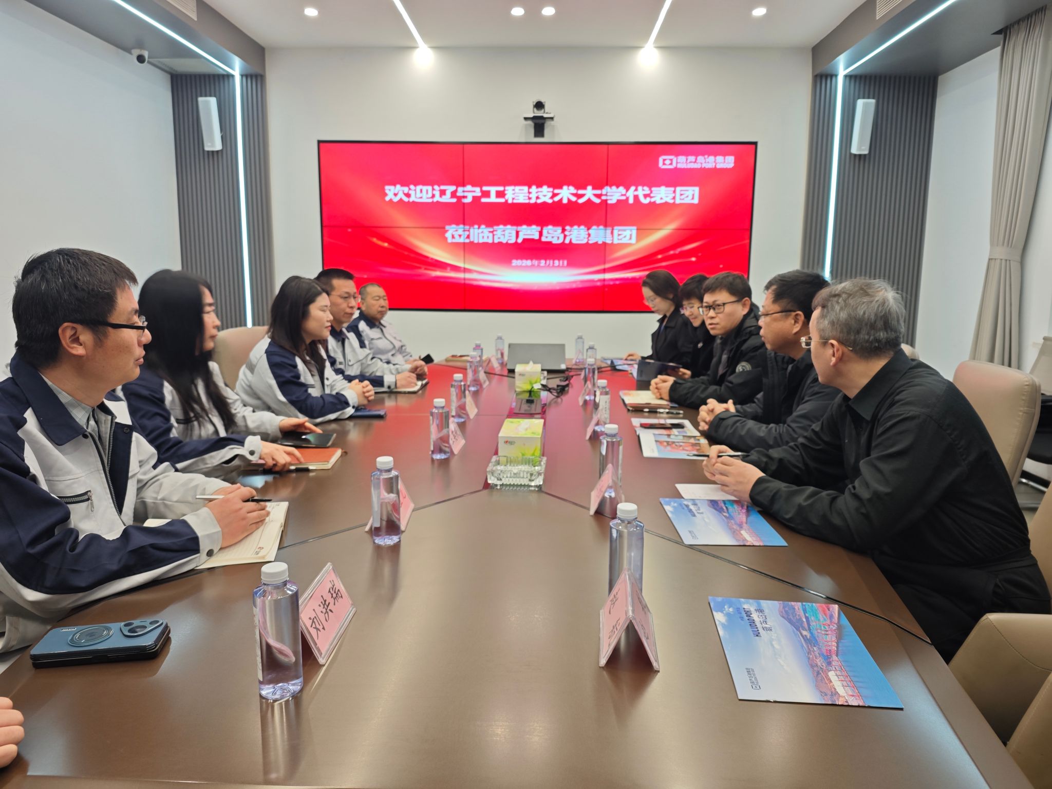 葫芦岛港集团有限公司人事经理李兵、行政经理苗振环、财务经理裴秀、工程经理严金龙、生产经理徐晓东、营销经理刘洪瑞、招聘经理王英秋就集团五大中心组织架构、部门职能、未来发展规划及人才需求等方面分别展开交流。贾凯威重点介绍了学院学科建设、师资力量及人才培养相关内容,期待能为葫芦岛港集团规划发展所遇问题提供可参考、可落地的路径建议。王健详细阐述了学院生源特点、各专业就业趋势,明确校企合作于企业发展、提升学生岗位胜任力的重要意义,并邀请集团参加学院春季双选会。与会老师分别就各自专业的人才培养特色与优势、产学研用融合情况进行了汇报。双方就课程共建、专业实习、社会实践、岗位招聘等合作内容展开深入探讨并达成初步共识与合作意向。