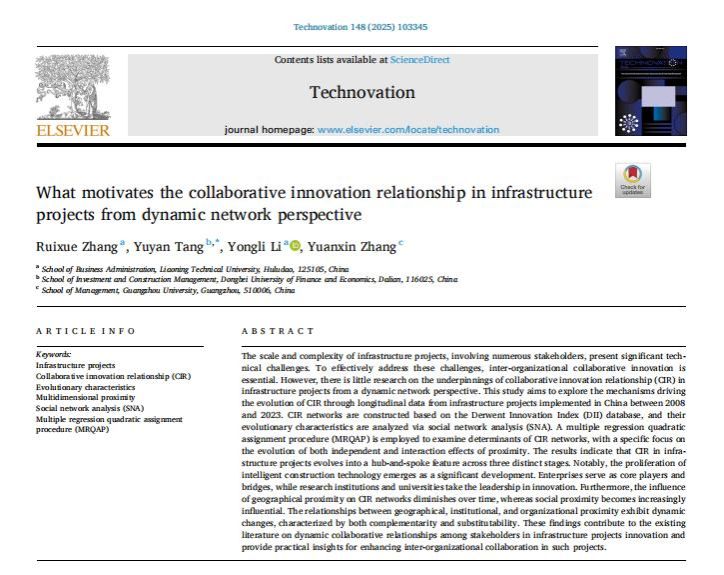 (通讯员 贾崇)近日,我院管理科学与工程学科创新团队张瑞雪、李永立老师,围绕“基础设施项目协同创新”这一研究方向,撰写的学术论文《What motivates the collaborative innovation relationship in infrastructure projects from dynamic network perspective》(doi.org/10.1016/j.technovation.2025.103345)被《Technovation》录用并在线发表(论文网址:https://doi.org/10.1016/j.technovation.2025.103345)。