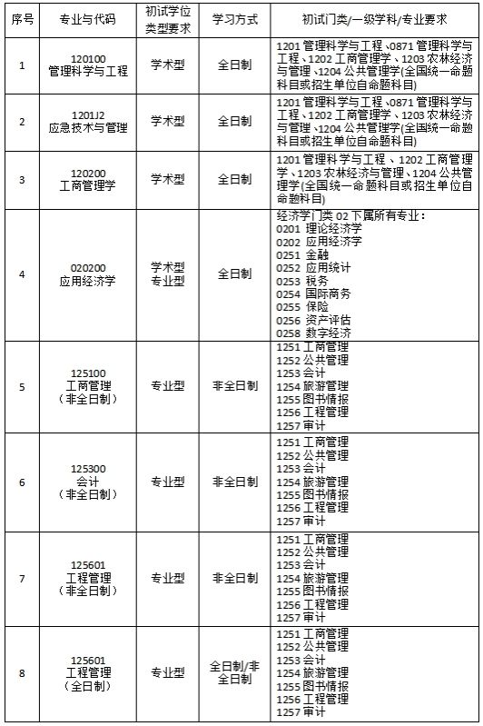 4.第一志愿报考工商管理、公共管理、旅游管理、工程管理、会计、图书情报、审计专业学位硕士的考生,在满足调入专业报考条件且初试成绩同时符合调出专业和调入专业在调入地区的全国初试成绩基本要求的基础上,可申请调剂我院相应专硕专业(领域)。