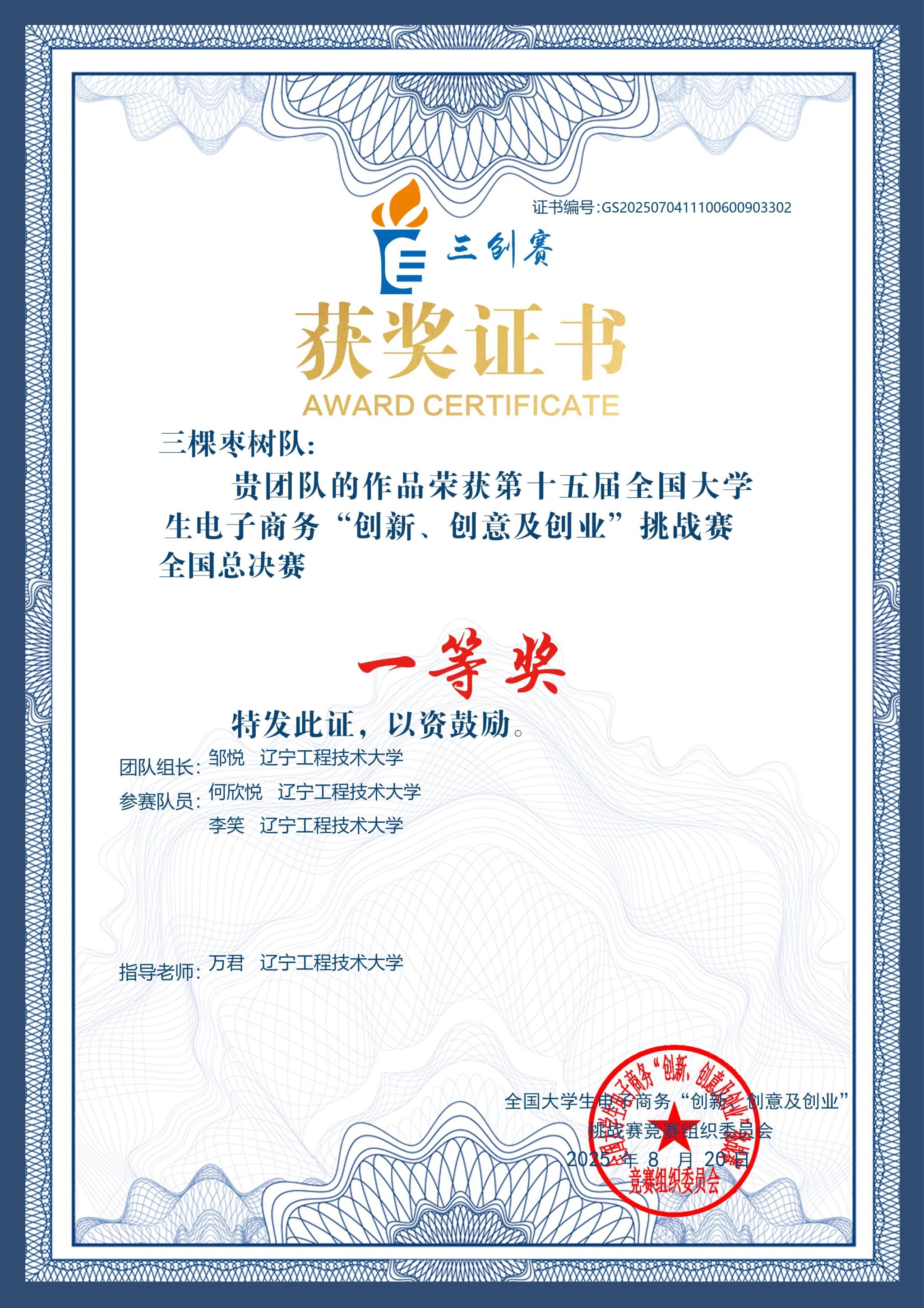 在本次全国总决赛中,我院研究生团队表现优异,勇创佳绩!由我院研究生导师万君教授指导,来自物流工程与管理专业的“三棵枣树队”研究生团队——邹悦、何欣悦、李笑,携其作品《参遇杏海:杏海湾即食海参全产业链构建——从生态养殖到全域营销矩阵》成功晋级常规赛全国总决赛。凭借项目的创新性、可行性与团队出色的表现,最终获得全国一等奖,将赛事最好成绩推向新高度。