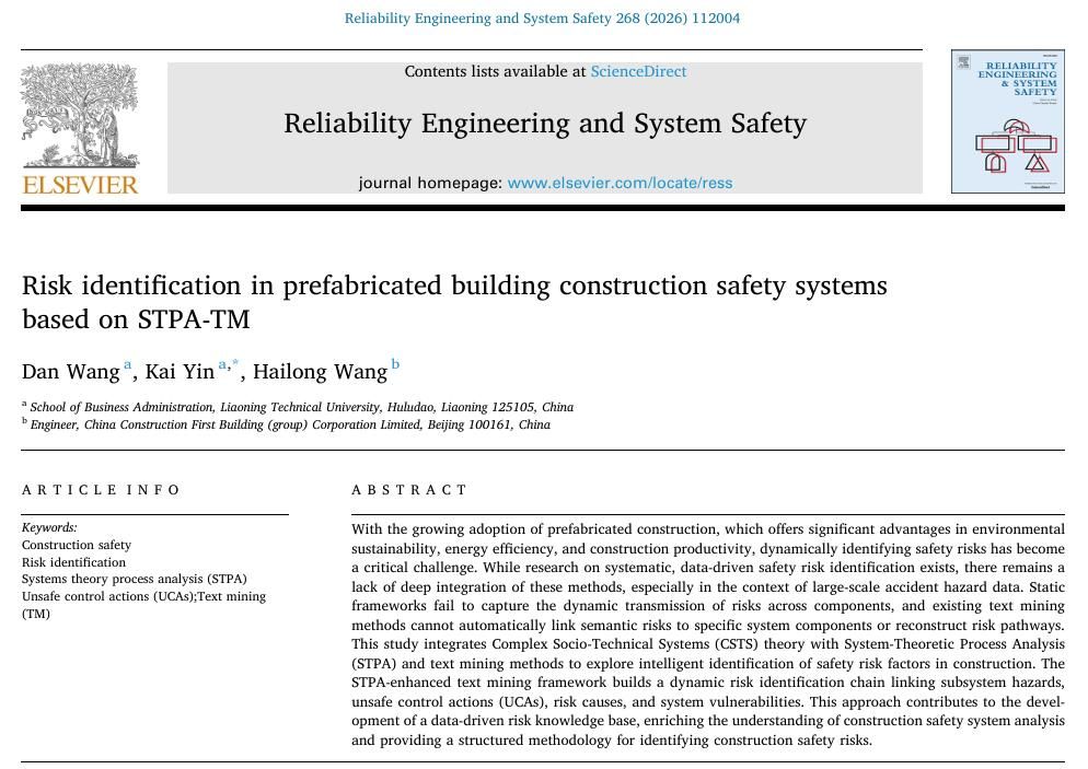 (通讯员 贾崇)近日,我院管理科学与工程学科“信息与工程管理”科研创新团队王丹老师及研究生尹凯,围绕“施工安全风险管理”这一研究方向,撰写的学术论文《Risk identification in prefabricated building construction safety systems based on STPA-TM》在《Reliability Engineering & System Safety》(简称《RESS》)期刊录用并在线发表:https://doi.org/10.1016/j.ress.2025.112004。