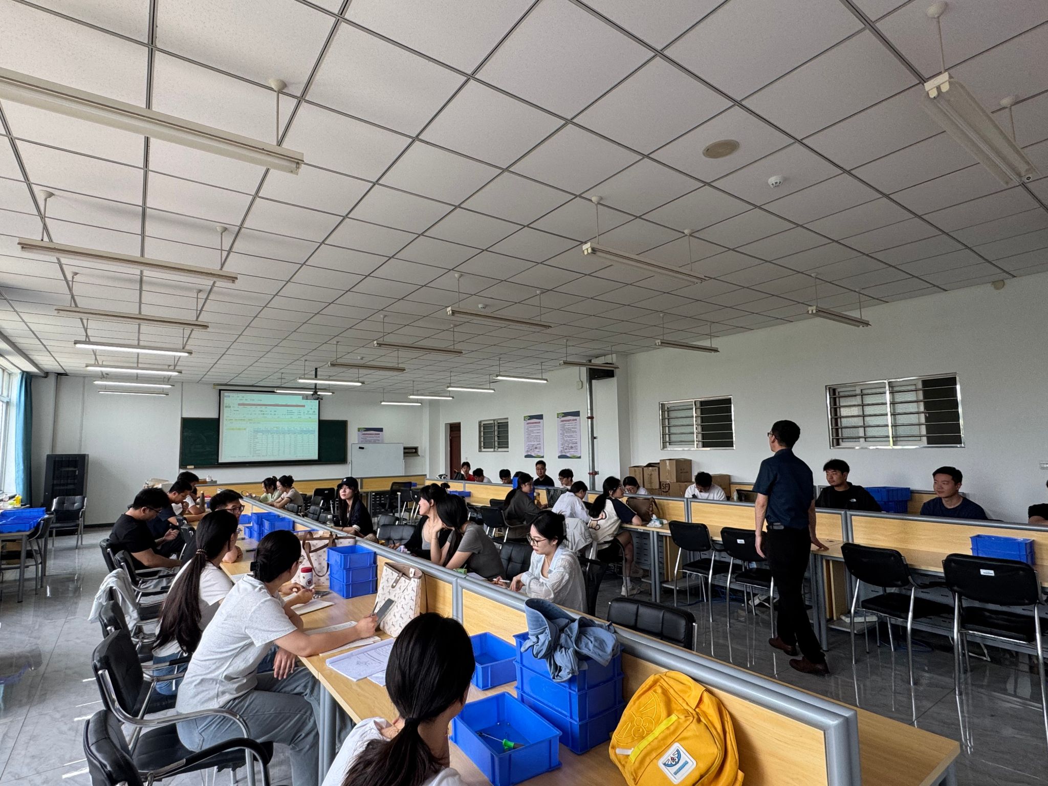 在实训启动日,高老师将同学分成两组并选出小组长,迅速建立专业化的协作体系。组长基于工业工程思维规划,分别设立流水线组、库存管理组、精益改善组和质量检测组,通过标准化的分工模式,使学生直观理解生产系统中“人、机、料、法、环”的协同逻辑。次日,实训聚焦方法论的实际应用,学生系统学习工序流程图绘制技术、5S现场管理体系及价值流图分析工具,通过可视化建模精确定位瓶颈工序。第三天,学生进行生产布局结构性改造,优化库存区至组装工位正前方,按“零件上线——部件组装——总装调试”的工艺顺序规划人员站位,形成“U型”紧凑布局。第四天,开展关键优化,利用秒表计时法精确拆解各工序耗时,启动了“人员精简化+工序模块化”改革,将组装人员从11人压缩至5人,通过IE工程合并重叠工序,建立标准化作业看板,完美诠释了“消除浪费即创造价值”的精益哲学。在周五的结营分享会上,各组成员分享了心得体会。同学们普遍认为,当5人团队实现超越11人的效率时,深刻认识到精益不仅仅是减少人员数量,而是通过流程重构释放系统潜能。