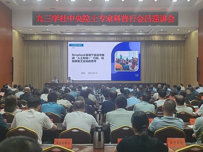 6月10日,九三学社中央院士专家科普行巡讲会在金昌举行。吴琦教授以《DeepSeek浪潮下金昌市推进“人工智能+”行动、赋能新型工业化的思考》为题作专题辅导。金昌市委常委、市委组织部部长、市委统战部部长赵小庚主持。九三学社甘肃省委员会专职副主委兼秘书长梁宝峰出席。全市各机关单位、部分企业的负责同志及各民主党派成员共180余人参加。